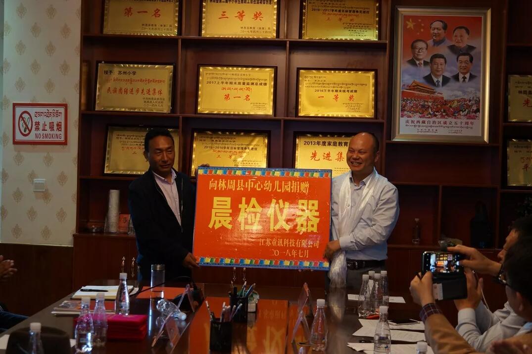 活動現場,楊總代表江蘇童訊科技有限公司為當地的蘇州小學中心幼兒園捐獻了“阿童目”的最新II代健康晨檢機器人,以提升當地園所的兒童健康和家園共育管理水平。
